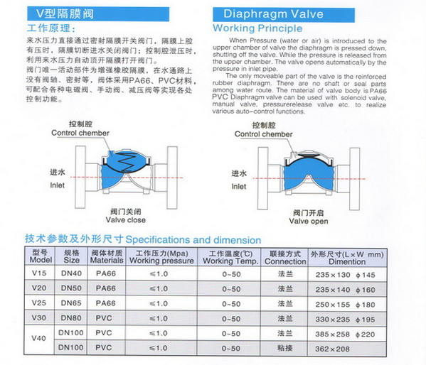 特點:V型隔膜閥采用上下雙控製腔設計,控製水流獨立於流體腔室,從而使閥門控製上更加靈活、可靠耐用,徹底杜絕了單腔控製閥可能存在的開關不靈、不嚴的隱患