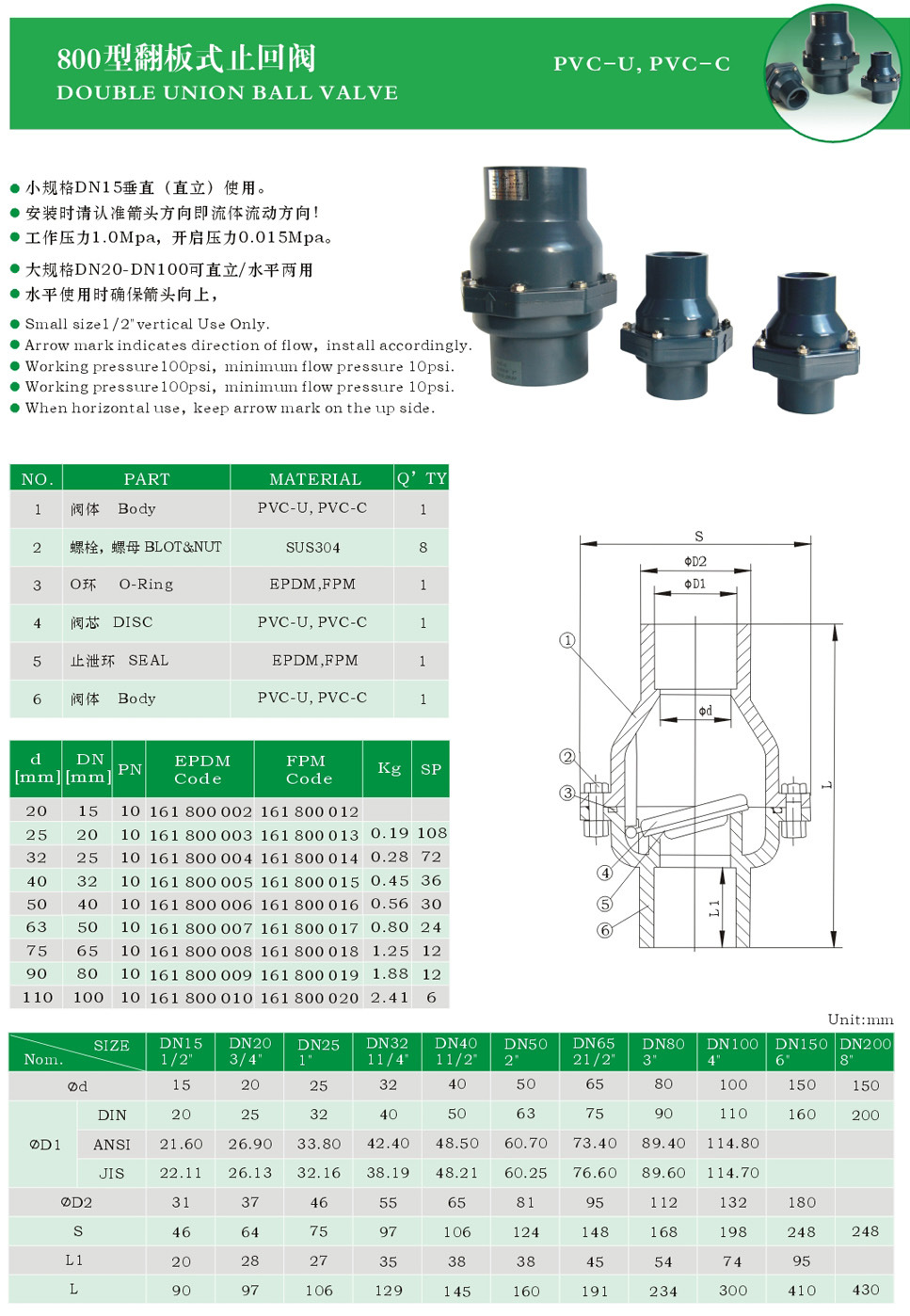 特點:UPVC翻板式止回閥常用於化工、輕工、礦冶、油田、電子、製藥、釀造、食品加工、建築、民用上下水等領域,起輸送各種腐蝕性介質和高純介質的作用,尤其適用於水處理及環保係統。